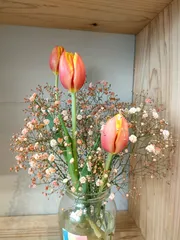 カフェに飾ってあったお花🌷チューリップって春のイメージだったけど、この時期にもあるんですね(^^)
