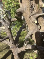 今日は庭にずっと生えている、アプリさまによれば「マンダリン」らしい木の剪定をしました。長年この庭にあって、一度も花をつけたことがなく、毎年ただただモッサリと葉がつくトゲトゲの木です。先日レモンの剪定に関する動画を観たこともあり、よし、もういっそ枯れても仕方ない、くらいの気持ちで思い切って剪定すること