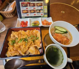 豚肉のやわらか味噌焼き重🐷 銀座ライオン新宿会館4階、本格焼肉&ジンギスカンばくよう亭のランチメニューです🐷プラス300円でミニ冷麺を付けました😊美味しかったです😊