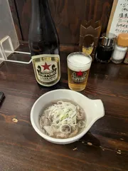 塩モツ煮込みを赤星できめる タン刺し白レバーネギ和え