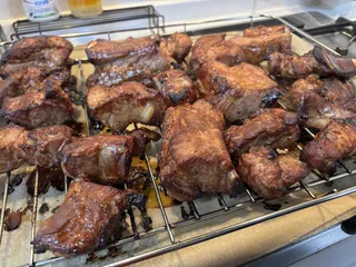 スペアリブ 先日ネットで安売りのスペアリブ(調理済み)を買うかどうか悩んで結局止めました。翌朝タウンに来たら美味しそうなスペアリブの写真があり、やっぱ買っておけば良かったかと思ったりしたのです。その後、行きつけのお肉屋さんへ行ったら普段あまり置いてない豚のスペアリブが安く売っているじゃないですか。世界が私にスペ