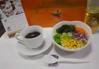 上品な白いカップで! 上品な白いカップで!定番のわかめサラダに今日は上品な白いカップで。ちょっと小さ目なのでサラダもヱビスもちょい小さ目に。