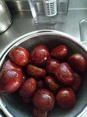大きな栗 4Lの立派な栗を購入!!久しぶりに渋皮煮作り。難関の皮剥きはかなりの確率で成功しましたが…失敗した栗で栗ご飯を同時進行してたら〜〜〜気が付いたら火が強くて…煮立たせすぎてふやけ過ぎてしまい10/27個の渋皮煮。。。💦
