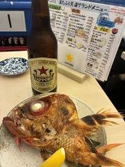万博帰り 万博帰りにたまたまKITTE大阪に寄ったお店に赤星あり🍺 イカの辛子明太子はお通しなのにおかわり自由😱 刺身も旨くアジフライは熱々ジューシーで最高❗️👍😋しっかり堪能いたしました🤤