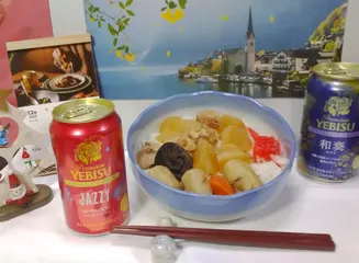 JAZZYと 得意の丼物!(#21) JAZZY と得意の丼物!(#21)今日の丼は鶏モモ肉と大根に里芋を加えた煮物です。JAZZY との相性は如何に?(丼なら俺だと思うけどなぁ~・・と言う顔で和奏が見てる?)