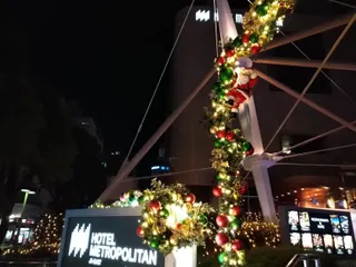 ホテルメトロポリタンにて ホテルメトロポリタンに、メトロポリタンプラザの方から行きました。アイキャッチ画像はその入り口の手前のところにいるサンタさんです。そして下はそのまま入り口を入ったところにあった、小さめのツリーです。こちらは南側のロビーのツリーですが、ピントがうまく合わなかったのが残念です。そのロビーには、2頭のトナカ