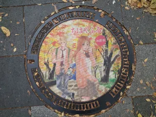 ちはやふるのデザインマンホール 目白庭園に行った後、京王線の府中駅に行き、ちはやふるのデザインマンボールを撮ってきました。主人公の綾瀬千早です。千早の1年下の西田優征と駒野勉です。同じく1年下の大江奏です。千早の幼馴染でライバルの真島太一と綿谷新です。真島太一です。小学生の頃の千早、太一、新の3人です。そばの歩道上に上のマンホール