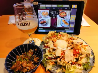 サラダ&ビール🩷 仕事の後、来週の相方誕生日用プレゼントを買いにきたついでに YEBISU BAR 😊今日は「蒸し鶏と胡桃のサラダ」と澄深し💚ローストポークのサラダも気になったけど、次回に。2杯目は施設限定半額クーポンでヱビスビール🍺ヱビスビールにしか使えないけど、毎月1枚もらえるのは嬉しい♬いまはアプリの半額クーポ