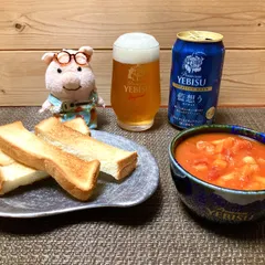 藍想う🍺✨ × ミネストローネ🍅✨ 今夜は、YEBISU CREATIVE BREW 藍想う🍺✨友人から「就職祝い」と差し入れでいただきました、手作りのミネストローネとともに…🍅✨ミネストローネって、野菜やお豆がたくさん食べれて、とても良いですねぇ☺️✨藍想う🍺も、ミネストローネも、美味しかったです〜🤭✨