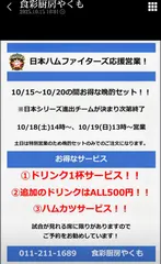 NEW 食彩厨房 やくも日ハム応援特別プログラム ■店舗名:食彩厨房 やくも ■エリア(都道府県&市/区/群):札幌中央区東西線出口⑤■おすすめの一品/一押しポイント:晩酌セット ■店舗サイト(公式HP、食べログなど):https://map.yahoo.co.jp/v3/place/HP-RHL17NzE?fr