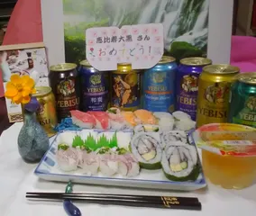 NEW 祝:ダイヤモンドランク! ダイヤモンドランク到達祝い!かなり苦労しましたが、やっと達成出来ました。今日は自分へのご褒美でちょっと豪華に・・ヤリイカ姿握り(前回旨かったので再度)と〆鯖の高菜巻(初めて)。ヱビ缶達に囲まれて、かんぱぁ~い!謝意はフリートーク欄で。