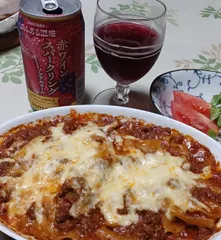 ラザニア🍝とワイン🍷😂 ラザニアを作ってみました🍝合わせるのは〰️🍷🍺?😢今日も休肝日なので😆赤ワインスパークリング➰ノンアル🍷でした😂