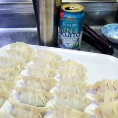 🌿モヒート飲みながら🌿 杜の香ジン&モヒート飲みながら餃子作り🎵🥟皮は市販のものです。 今日はほうれん草と合挽き肉の餃子です。焼き上がりは先日のチリのカベルネで🍷👍