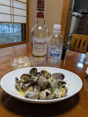 アサリの酒蒸しで乾杯🍻 息子が突然アサリを買ってきて、酒蒸しを作ってくれました😄まだ日が高いですが飲むしかないでしょう😄乾杯🍻酒蒸し、めっちゃ美味しい🤤