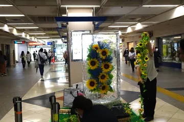 駅の氷柱 池袋駅の中央通路の真ん中に、向日葵を埋め込んだ氷柱が設置されました。下は家への帰りに見たのですが、皆さんが撫でまわしてずいぶん小さくなっています。