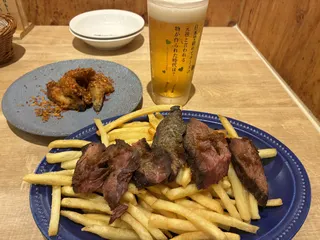 本日グランドオープン ずるいポテト、直営店のみ提供のバッファローチキン。おすすめ。マルエフ生中、ハイボール、レモンサワー、何杯呑んでも1円。行った方がお得。