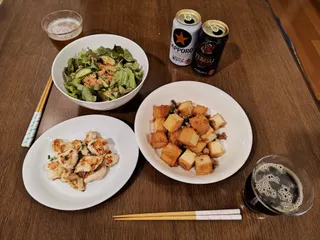 厚揚げと挽肉の甘辛炒め🐷🟨鶏胸肉の塩マヨ焼き🐔サニーレタス・キュウリ・干し海老のサラダ🥗【お酒】サッポロ黒ラベルヱビス プレミアムブラック老松酒造 大分麦焼酎