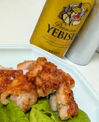 塩からあげと。 塩からあげ、作っている途中で片栗粉が少なくなっているのに気づいてあたふた。ギリギリ足りた感じです。ヱビスと唐揚げ。間違い無い組み合わせ。