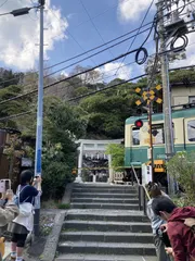 皆さん、こんなところで何してるんですか❓ と、聞こうとしたら、一斉に激写開始😱つられて私も思わずシャッター😅御霊神社の鳥居⛩️と江ノ電🚃のツーショットがバズっていたらしく、私も偶然ですが、ベストショットが撮れました😇