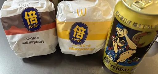 ヱビスと倍バーガー🍔 レギュラーバーガーのパティが倍で通常価格にプラス100円(税込)はお得なのかな🤔
