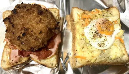 朝食🍞 月見バーガーみたく作るはずが🫣合わせて切ったら🤣😂グチャグチャに🫢でも、味はいけましたよ🤘 胡桃パン🍞マヨネーズロースハムコールスロートマトのスパイス煮メンチカツ玉子
