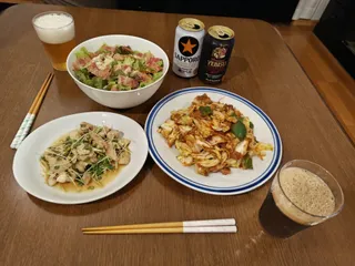 回鍋肉🥬🐽🫑鶏皮と貝割れのポン酢和え🐔サニーレタス・キュウリ・ベーコンのサラダ🥗【お酒】サッポロ黒ラベルヱビス プレミアムブラック老松酒造 大分麦焼酎最近、夫の仕事が忙しく、日曜日も仕事だったり帰宅時間がハッキリしなかったり21時30分前後の帰宅になったりしているので、お久しぶりの私の手料理になりま