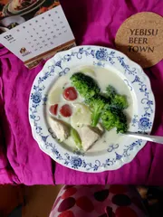 クリームシチュー おはようございます。早朝アルバイトのため、早起きしました。 写真は昨日の夕食のクリームシチューです。分量どおりに作ったけど少し薄味でした。ブロッコリーは緑色を保つため最後に入れたので少々かためでした。 冬になると無性にクリーム系のものが食べたくなります。(グラコロとか)フリートー