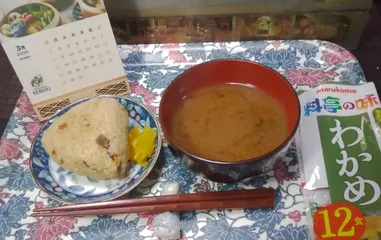 おむすび🍙と味噌汁!今日は体調不良の為、急遽禁酒日(ノンアルデイ)に。炊き込みご飯のおむすびとインスタント味噌汁で。味噌汁なんて、久し振りだなぁ~。