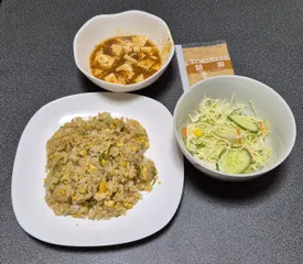 昨日の夕食… 昨日の夕食…。先日,肉の日のW焼肉定食を投稿しましたが,昨日,再度購入しました(11/30まで290円引)。⇐肉の写真は?…前回と被るので無し。何でチャーハン?…。肉の余分な油が容器に残るので,それを利用し,ご飯を炒める。ご飯も特盛にしているので(特盛も並盛も同価格)…。ネギは,別添の大根おろしとネ
