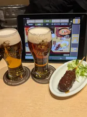 愛知みかわ豚の味噌串カツをプレミアムエールと琥珀エビスのTASTING OF YEBISUセットできめる 帰省途中で寄り道しました✨️今年はエビスで〆ます🍺来年もよろしくお願いします🙏時間がなかったので滞在時間15分ぐらいでしたが😅