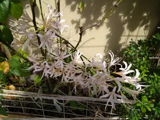 白い彼岸花? 朝の散歩で見かけたのですが、普通の赤い彼岸花の横に、同じような茎から咲いていた白い花がありました。アップにしてみましたが、やっぱり彼岸花としか思えません。ちなみに青い彼岸花は、どこにあるのでしょうか(^.^)