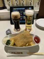 上野の西郷さんから3153エレベーター降りたら、いきなりライオン😱 逃げられないので、半額黒ラベルと無料ブラック、ついでにフィッシュ&チップス😅