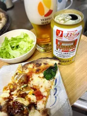 今週の自分へのご褒美 ヤオコーで焼きたてピザを買って、ヤオコーの135周年を祝うエビスビールで、乾杯の朝。めっちゃ美味しい、感動の土曜日です。