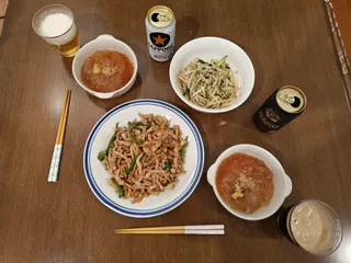 ある日の夕食〈139〉 青椒肉絲ところてんもやしとキュウリのナムル【お酒】サッポロ黒ラベルヱビス プレミアムブラック老松酒造 大分麦焼酎