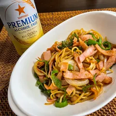 ランチにノンアル♪ ありあわせで焼きそばを作りました。お昼ご飯はノンアルと一緒🎶