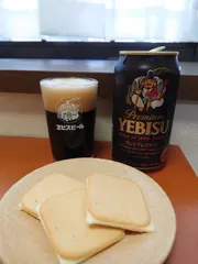 クッキーとYEBISU 東京・港区のnow on Cheese。CLASSIC CHEESE SAND COOKIESスモーキーな風味が魅力的な「スモークチーズ&カマンベール」とあります。カマンベールチーズが効いたクッキーと黒ヱビス、美味しい。