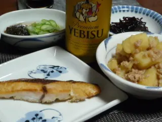 今日も楽しい晩酌!!ヱビスビールが美味しい!!たまらない美味しさに乾杯です。 今日のつまみは、ブリの塩焼き、肉じゃが、もずくとキュウリの酢の物、昆布の佃煮、といろいろありました。良い時間を過ごせました。