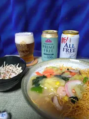 今日は休肝日です。 今日は休肝日です。SAPPOROのPREMIUM PRIME FREEと☀️⛩️新ALL FREEで皿うどん風、ごぼうと人参のサラダとともに美味しくいただきました。ごちそうさまでした。飲めないんで、とっとと寝たい気分です🙏🥱😎👍。