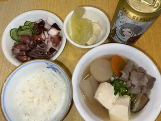 キムチと肉団子とおでん風。 「ごはんがススムクン」のキムチ盛り合わせと、珍しいニラキムチ。711のたけのこ入り肉団子はなかなか美味い。そして、おでんの残り。大根は染み染み。😋プレミアムエールといっしょに。