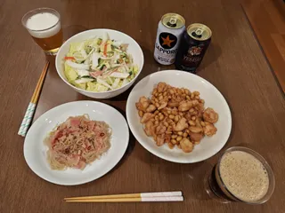 鶏肉と水煮大豆の甘辛炒め🐔🫛白滝とベーコンのペペロンチーノ炒め🥓🧄🌶️白菜・キュウリ・カニカマのサラダ🥗【お酒】サッポロ黒ラベルヱビス プレミアムブラック老松酒造 大分麦焼酎