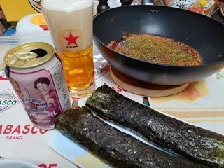 さくらはまだまだ先ですがビールは美味しくいただけますお好み焼きに一味をかけてピリ辛にしてみるとまたおいしいですね