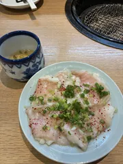 プレミアムエール🍺鯵にぎり、野菜炒め…牛切落し・てっちゃん・平天・キャベツ・ほうれん草・白葱・🥕入り☝🏻味つけは、香辛料と3種のタレをオリジナルブレンドした焼肉のタレです!😋