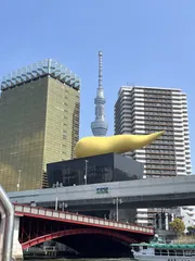 吾妻橋のアサヒビール本社の金の泡🍻にスカイツリーが乗ってるよう🥳