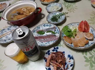 おでん🍢にスーパードライ🍻 今〈アサヒビール〉が大変なことに😖💦〰️他社ですが、他人事ではいられない😱😱と言うわけでは有りませんが、今晩は頂き物ですが、アサヒスーパードライ🍻ロング缶をグッ➰➰と🍻もう、おでんの季節で🍢鯵をタタキで🐟スルメイカを腸を使って味付け🦑豚ロース味噌漬け🐷食べ過ぎました👋😵🍴😋😋😋