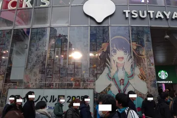ソラマチから渋谷に向かい、SHIBUYA TSUTAYAを覗いてみたら、KADOKAWAのライトノベル展をやっていました。入り口上のディスプレイでは、これらの映像が流れていました。入口入ったところの案内です。そして通路には、今までの作品の表紙がちりばめられています。通路を通って奥の展示スペースにあっ