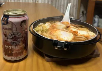 豚キムチうどんに🌸🍺 😋 豚キムチうどんの辛さに、ほんのり甘く感じる🌸🍺が 合うー😋