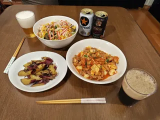 豆腐入り豚キムチ炒め⬜️🐽🥬塩こん部長のさつまいもバター🍠🧈サニーレタス・キュウリ・干し海老のサラダ🥗【お酒】サッポロ黒ラベルヱビス プレミアムブラック老松酒造 大分麦焼酎