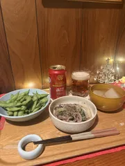 出汁で煮たおでんの大根だけの煮物に枝豆🫛、濃いめのJAZZYは砂肝塩炒めに合わないはずがない〜😋美味しかったです🙏🏻 YEBISU✖️Dewarsのグラス🥃がありましたのでしばらくは こちらで我慢ガマン😅