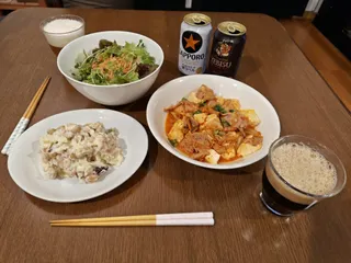 豆腐入り豚キムチ炒め🐷⬜️🥬サラダ豆入りポテトサラダ🥔🫛サニーレタス・貝割れ・干し海老のサラダ🥗【お酒】サッポロ黒ラベルヱビス プレミアムブラック老松酒造 大分麦焼酎