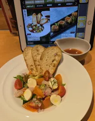 ふくいサーモンと甘海老のカクテルサラダ バケットの着地点がわからなかったけど、美味しかったです😊ノルウェーサーモンとふくいサーモンの食べ比べをやってみたい人生でした😅